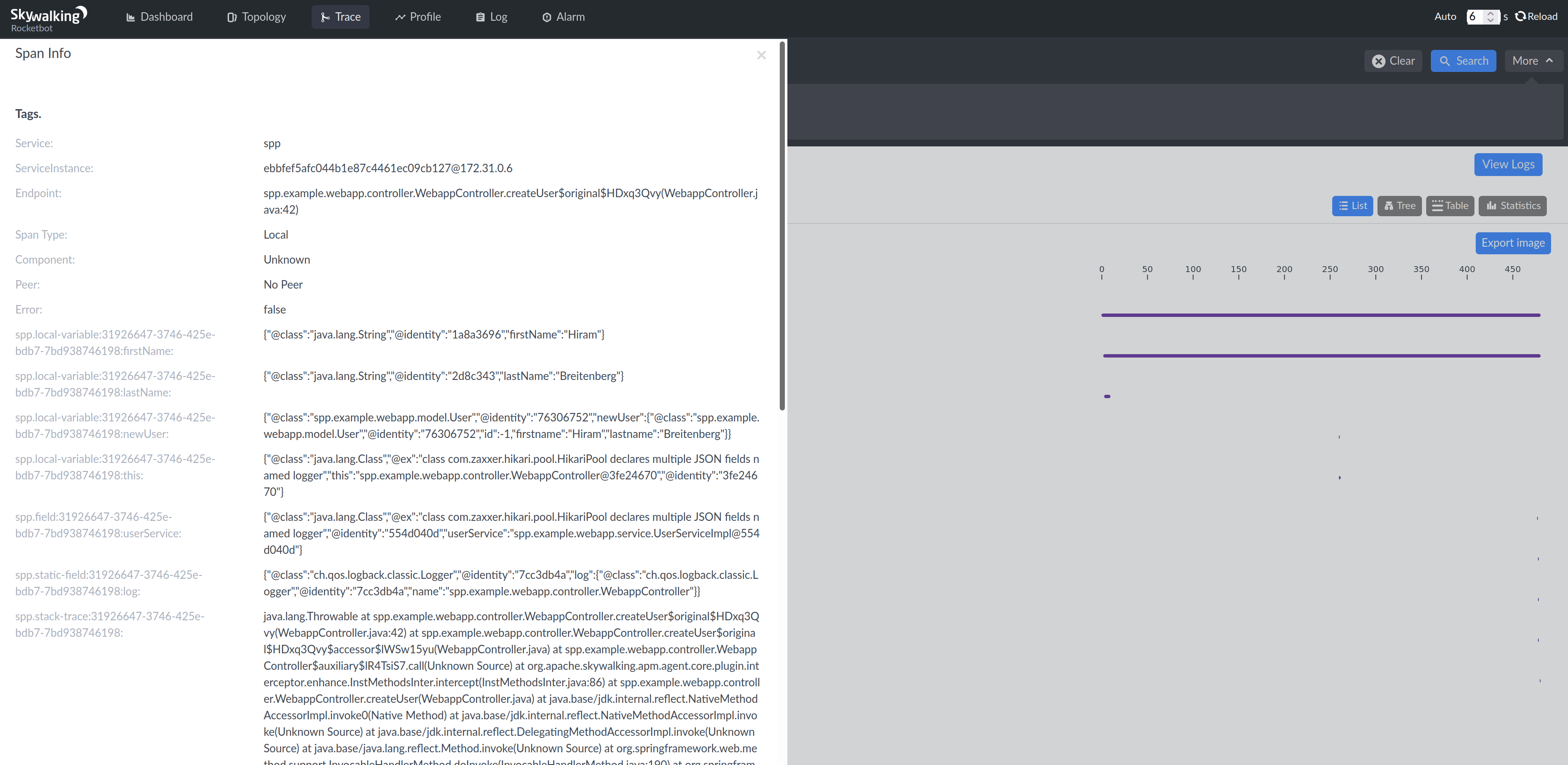 Even though the above does not resemble what’s normally thought of as a breakpoint, the necessary information is there. With live processors added to your SkyWalking installation, this data is refined and may be viewed more traditionally via live interfaces.