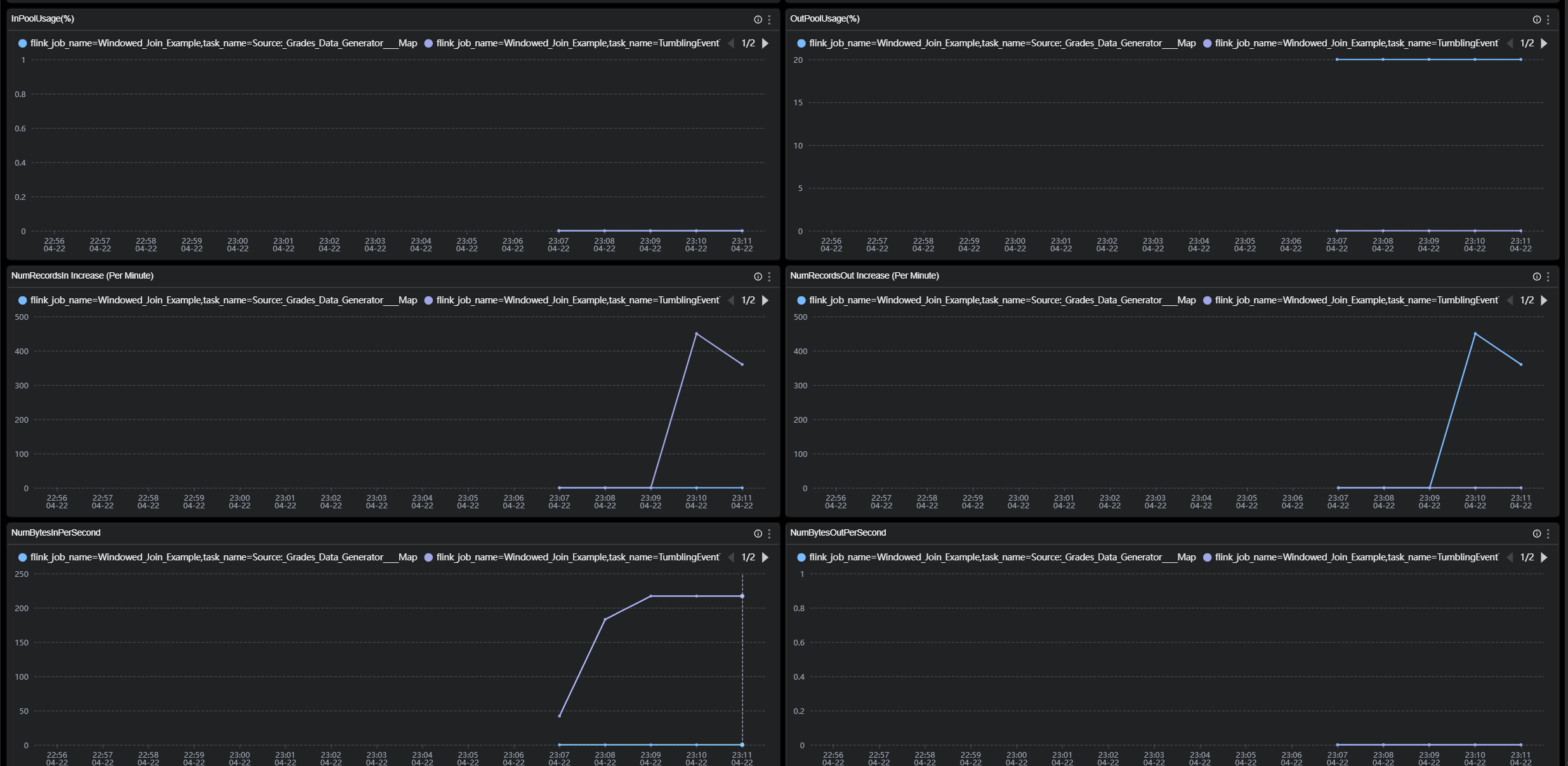 • NumRecordsIn:The number of records received per minute by the TaskManager.
